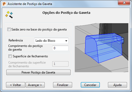 Se você selecionou a opção Saída zero na base do postiço da gaveta, pode clicar somente em Finalizar pois não há necessidade de modificar a superfície de fechamento.