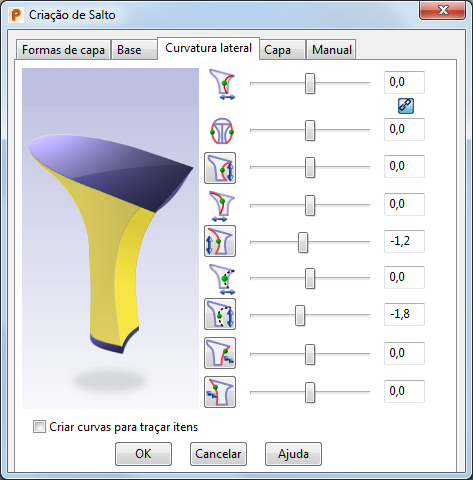 Utilize a guia Curvatura lateral para especificar os parâmetros que serão utilizados ao criar a lateral do salto (mostrada em amarelo no diagrama).