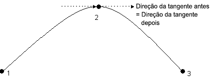 Você pode configurar as direções das tangentes antes de depois do ponto independentemente ou ambas juntas. Se ambas forem definidas, a curva será suave em relação às tangentes nesse ponto. A figura abaixo mostra um exemplo onde a direção da tangente antes é igual à direção da tangente depois no ponto 2.