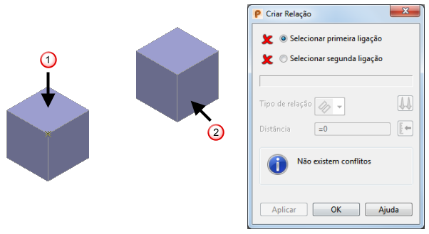Utilize a caixa de diálogo Criar Relação para criar relações entre componentes ao selecionar ligações. Neste exemplo, é criada uma relação entre dois componentes de bloco sólido: