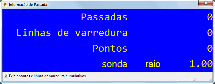 na barra de ferramentas Adquirir Pontos para exibir a caixa de diálogo Informação de Passada. Essa caixa de diálogo será exibida quando você acessar a barra de ferramentas, caso você tenha selecionado Exibir diálogo de informação de varredura em tempo real no diálogo Arquivo > Opções > Opções de Aplicativo > Geral > Braço.