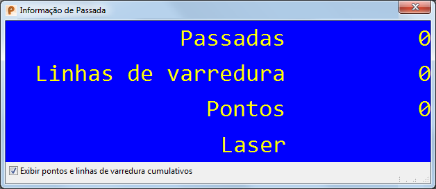 A caixa de diálogo Informação de Passada exibe o número de Passadas, Linhas de Varredura e Pontos que foram capturados na sessão atual. Ela também mostra o tipo de dispositivo que está conectado: