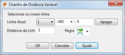 A opção Variável fica disponível ao clicar em Aplicar para criar um chanfro. Caso você tenha selecionado o caminho, mas ainda não tenha criado o chanfro, selecione o botão Avançado para criar um chanfro de distância variável. Se selecionou esta opção, você pode agora editar a distância ao longo do último chanfro criado.