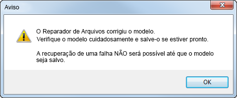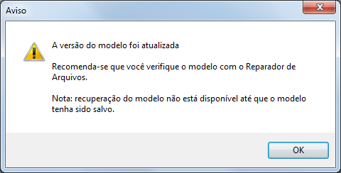 - Se Executar reparador de arquivos interativamente ao atualizar modelo estiver selecionado e a versão do modelo tiver sido atualizada, o Reparador de Arquivos será executado interativamente. O seguinte diálogo de aviso é exibido: