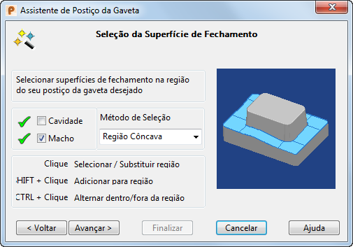 - Selecione Cavidade e selecione as superfícies de fechamento nesse inserto do molde. Você agora pode selecionar parte das superfícies de fechamento em vez de selecionar todas as superfícies de fechamento.
