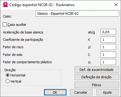 Os parâmetros de uma análise sísmica da estrutura dependem de uma norma sísmica usada durante os cálculos de uma estrutura influenciada pelo impacto sísmico. Selecione a norma sísmica espanhola NCSR-02 na caixa de diálogo Nova definição de caso ou clique em Parâmetros na caixa de diálogo Tipo de análise.