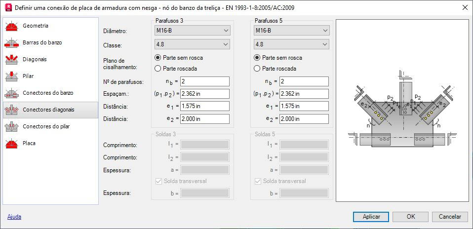 - diâmetro e classe de parafusos usados para conectar a barra com a placa com nesga e a organização de parafusos na barra (se a conexão aparafusada for selecionada para esta barra)
