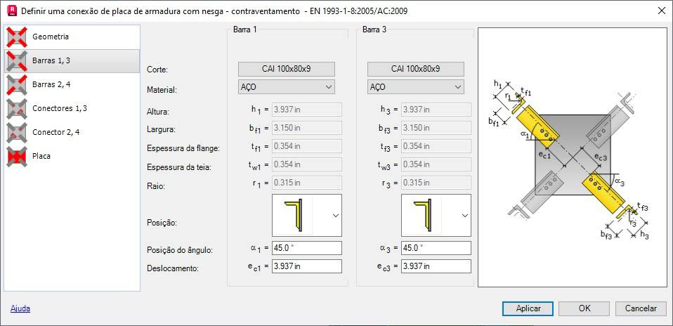 Use a guia Barras 1, 3, para definir parâmetros básicos de barras que se unem com a placa com nesga e estão posicionadas na linha 1 e 3. Especificar