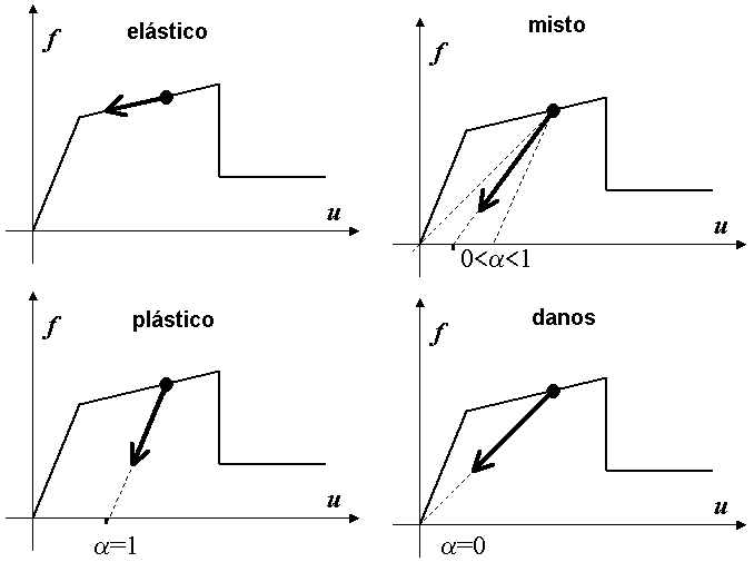 Na análise plástica, o método de descarregamento também precisa ser especificado. Ele determina o caminho do comportamento de um material após a resistência ao escoamento ser ultrapassada durante o descarregamento, quando as deformações ficam menores (o gradiente de deformação é negativo). Existem quatro tipos de comportamento de material (consulte a imagem abaixo):