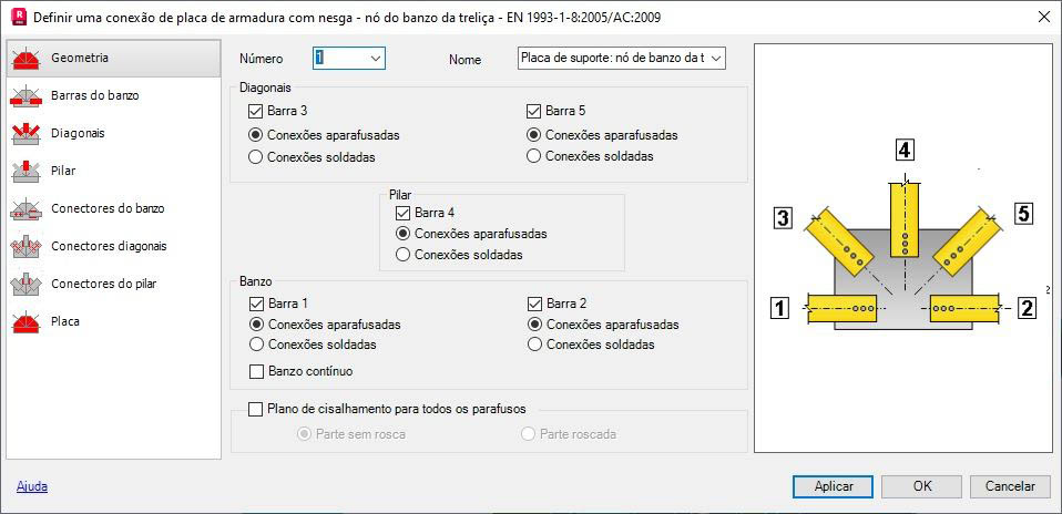 método de conectar as barras individuais à placa com nesga (conexão aparafusada ou soldada).