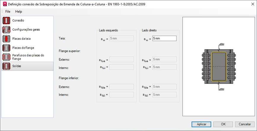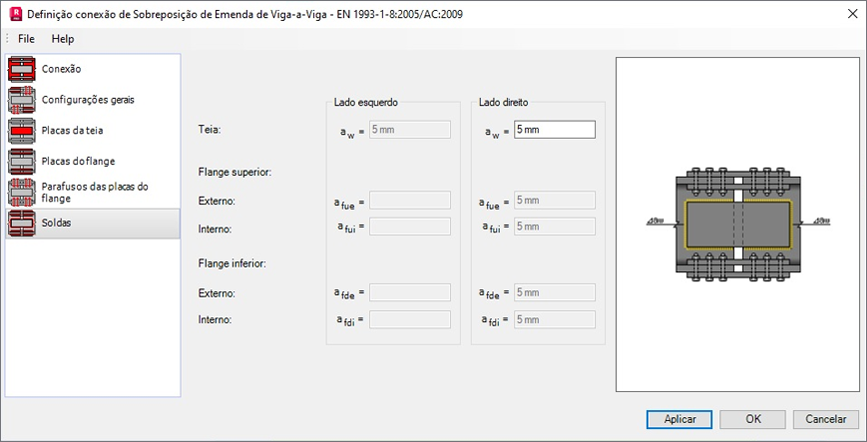 Utilize o painel Soldas para definir a espessura de soldas que conectam as placas com as barras.