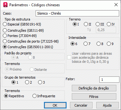 Os parâmetros de uma análise sísmica da estrutura dependem de uma norma sísmica usada durante os cálculos de uma estrutura influenciada pelo impacto sísmico. Selecione as normas sísmicas chinesas na caixa de diálogo Nova definição de caso ou clique em Parâmetros na caixa de diálogo Tipo de análise.
