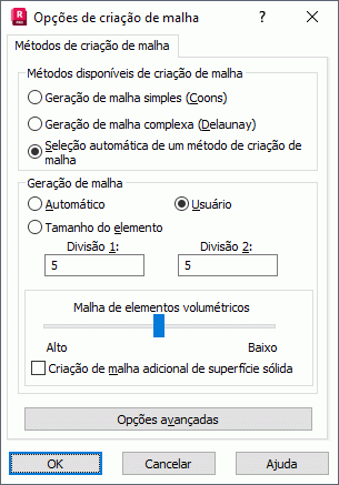 A caixa de diálogo a seguir permite selecionar os parâmetros para uma malha de elementos finitos volumétricos. Essa opção está disponível no módulo Projeto de estrutura volumétrica após selecionar um elemento de estrutura volumétrica e clicar no menu Análise > Malha > Opções de malha.