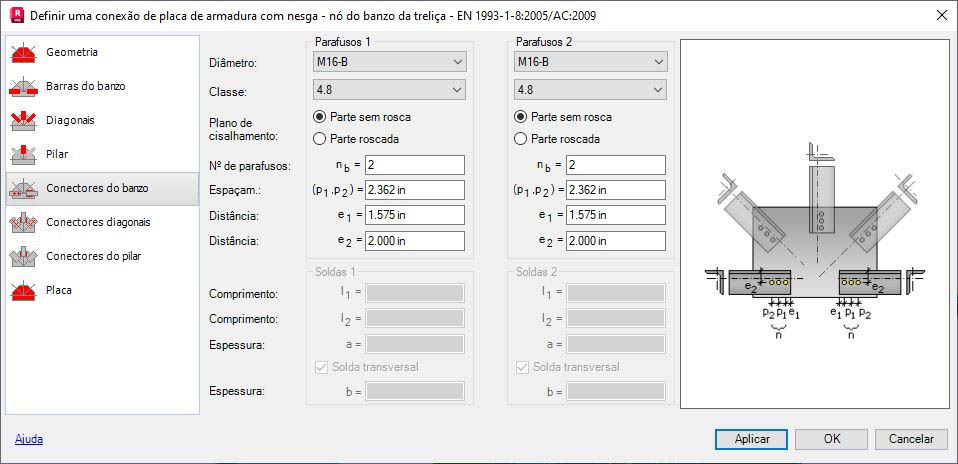 - diâmetro e classe de parafusos usados para conectar a barra com a placa com nesga e a organização de parafusos na barra (se a conexão aparafusada for selecionada para esta barra)