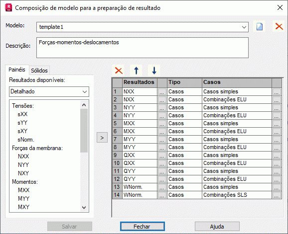 - A coluna Tipo determina quais tipos de resultados (forças, momentos, tensões, deslocamentos entre outros) devem ser preparados.