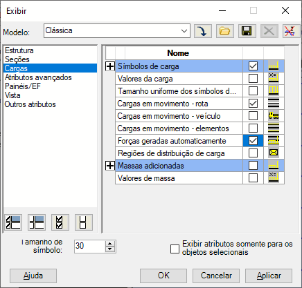 Também é possível visualizar a distribuição da carga de pressão para elementos finitos (caso contrário, é usado o método de média de pressão). Clique em Vista > Exibir e selecione Cargas no painel esquerdo. Selecione Forças geradas automaticamente na tabela de exibição.