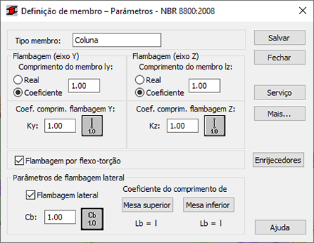 - Coeficientes dos comprimentos de flambagem (Ky e Kz)