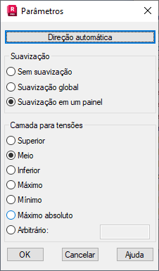 - A camada: superior, central, inferior, máxima, mínima, máxima absoluta ou arbitrária (as coordenadas são fornecidas no campo ao lado da opção), no campo Camada para tensões. A seleção de uma camada é importante ao apresentar os resultados de tensões em lajes.