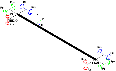 - (Rx, Ry ou Rz) “+” ou “-” – Especificam as rotações de articulação Rx, Ry ou Rz no nó inicial ou final do elemento do membro, na direção compatível (“+”) ou oposta (“-”), no que diz respeito ao eixo do sistema de coordenadas local do membro (de acordo com o princípio do parafuso do lado direito). A imagem a seguir mostra as articulações de rotação possíveis.