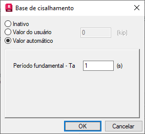 Use essa caixa de diálogo para selecionar como levar em conta a força de cisalhamento base: calcule de acordo com as provisões da norma sísmica (a opção Valor automático) ou especifique (a opção Valor do usuário).
