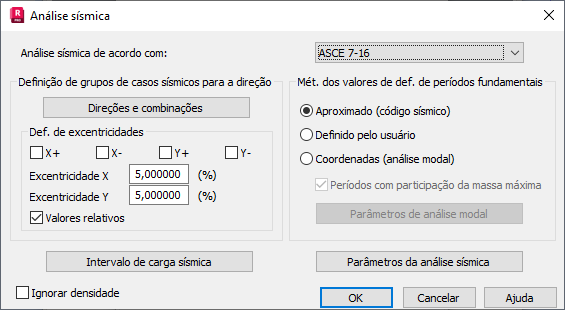 Na parte inferior da caixa de diálogo, estão localizados os botões Intervalo de carga sísmica e Parâmetros de análise sísmica.