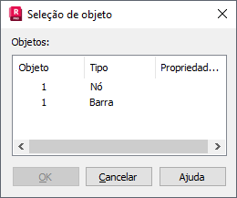Ela lista todos os objetos de estrutura próximos ao local em que você clicou com o mouse. Este exemplo lista um nó e barras, mas pode conter outros objetos, como arcos, polilinhas e círculos. Para selecionar um elemento, realce-o e clique em OK.