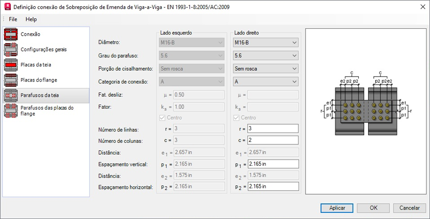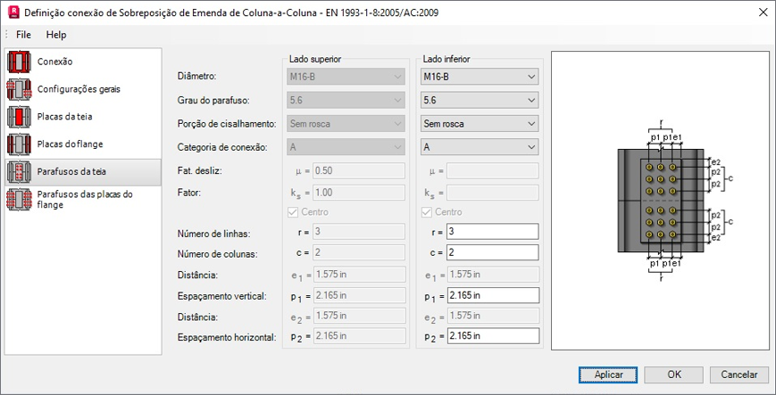 Utilize o painel Parafusos da alma para definir os parâmetros de parafusos que conectam a placa com as almas da barra.