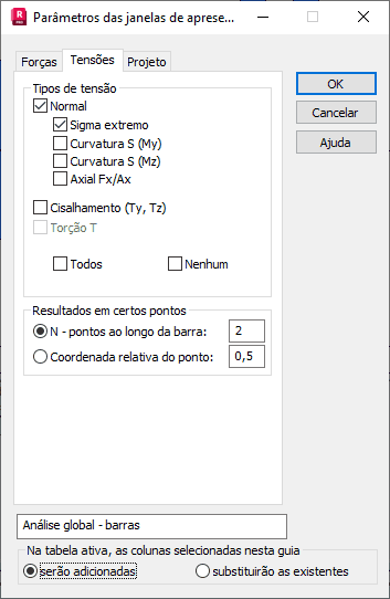 É possível selecionar os valores a serem apresentados na tabela e no diagrama. Clique com o botão direito do mouse e selecione Colunas da tabela para abrir a caixa de diálogo Parâmetros das janelas de apresentação. É possível selecionar os parâmetros a serem apresentados na análise global dos membros da estrutura nessa caixa de diálogo. Eles consistem nas guias Forças, Tensões e Projeto.