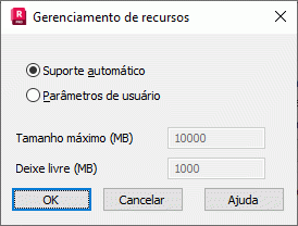 Use essa caixa de diálogo para especificar o espaço em disco máximo necessário para salvar buffers com resultados. Por padrão, a opção Suporte automático está ativada, mas nem todos os campos de edição estão disponíveis.