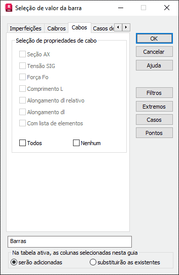 - Tensão SIG – uma coluna para a tensão normal no cabo para o caso de montagem (calculado com relação ao banzo do cabo) que deve ser obtida para as cargas abrangidas pelo caso de montagem.