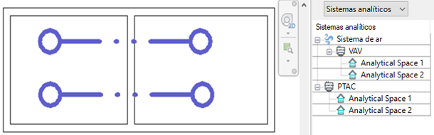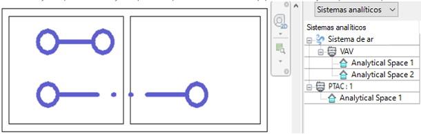 - É mostrada abaixo uma configuração inválida. O Espaço analítico 1 e o Espaço analítico 2 estão presentes no equipamento de zona do VAV, mas o Espaço analítico 2 não está presente no PTAC.