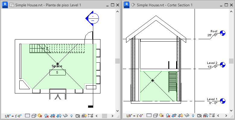 - Feche todas as vistas, exceto a vista de corte e a planta de piso onde deseja colocar o espaço, e digite w t no teclado para colocar as duas vistas lado a lado.