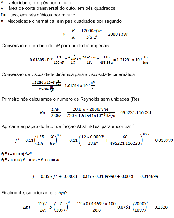 O exemplo a seguir mostra como o Revit calcula a queda de pressão para um segmento de 100 pés de duto retangular de 36" x 24" suportando um fluxo de ar de 12.000 CFM.