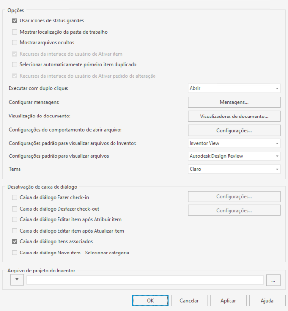 - Configurações padrão para visualizar arquivos do Inventor