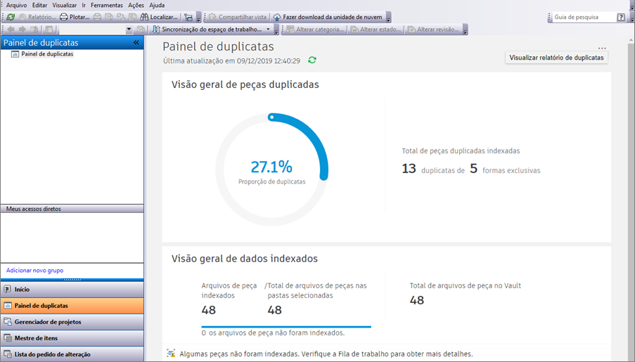 Após a indexação dos arquivos, você poderá visualizar os dados no Painel de duplicatas. No cliente do Vault, clique em Painel de duplicatas. Você pode visualizar o relatório de peças duplicadas e exportá-lo para o formato Excel, PDF ou Word.