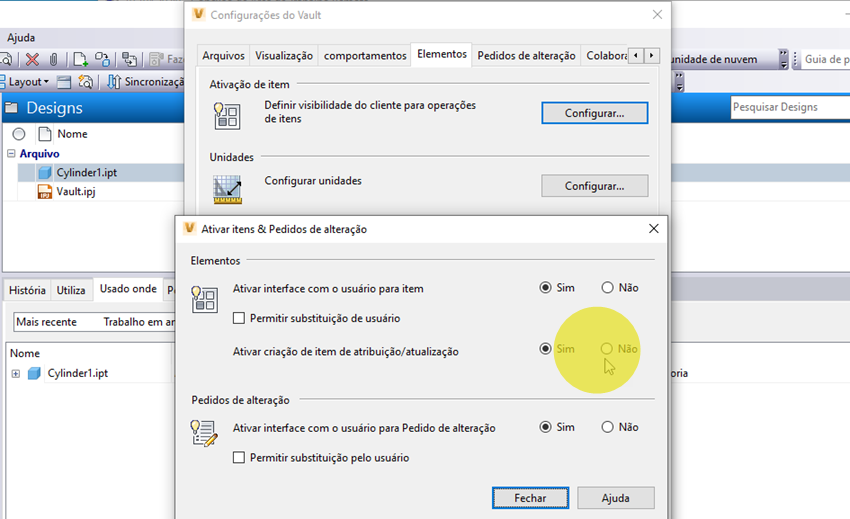 Quando esta opção está desativada, os usuários não podem atribuir nem atualizar itens no cliente do Vault e no Inventor usando a opção do menu de contexto das guias "Usos" e "Onde é usado" da caixa de diálogo "Mostrar detalhes".