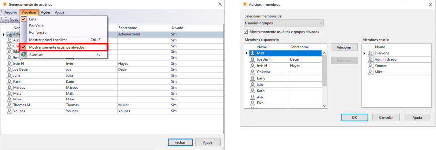 A utilização da opção no menu suspenso Vista permite ocultar ou mostrar usuários desativados.