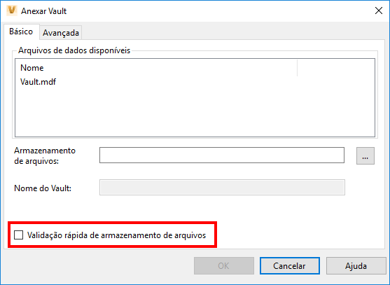 Foi adicionada uma nova opção para permitir a validação rápida de arquivos quando um vault é anexado ao ADMS Console. Quando um vault é anexado ou um backup é restaurado, o processo executa a validação do armazenamento de arquivos. Essa validação verifica a checksum no Vault dos arquivos contidos no armazenamento de arquivos. No caso de implantações grandes, de nível corporativo, a etapa de validação pode levar um tempo extremamente longo. Essa nova opção só permite verificar a existência do arquivo (não inclui a verificação de checksum), o que agiliza a validação e a conclusão do processo.