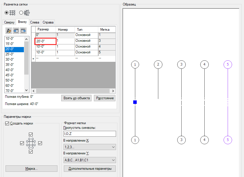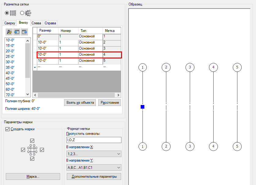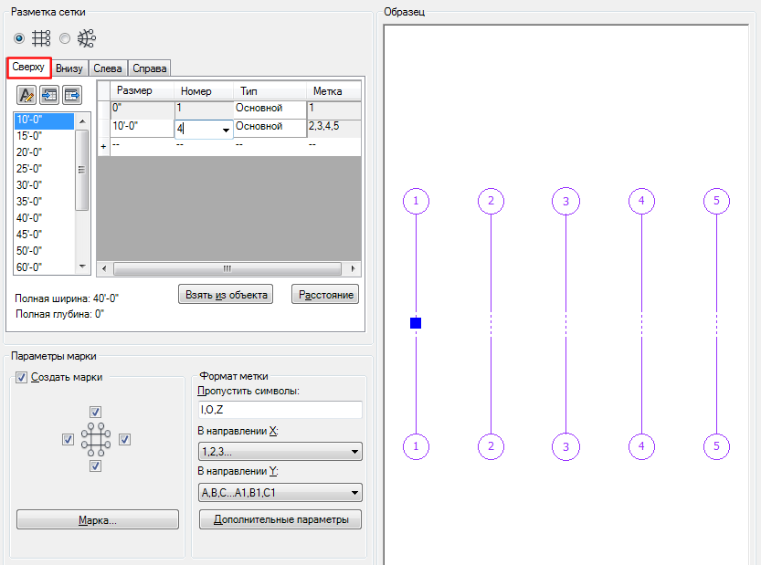 - Прежде всего сформируйте компоновку сетки для той стороны, которая содержит большее количество линий сетки. Например, если требуется создать сетку с линиями 1, 2, 3, 4, 5 сверху и 1, 3, 4, 5 снизу, вначале перейдите на вкладку "Сверху" и сформируйте четыре пролета на требуемом расстоянии.