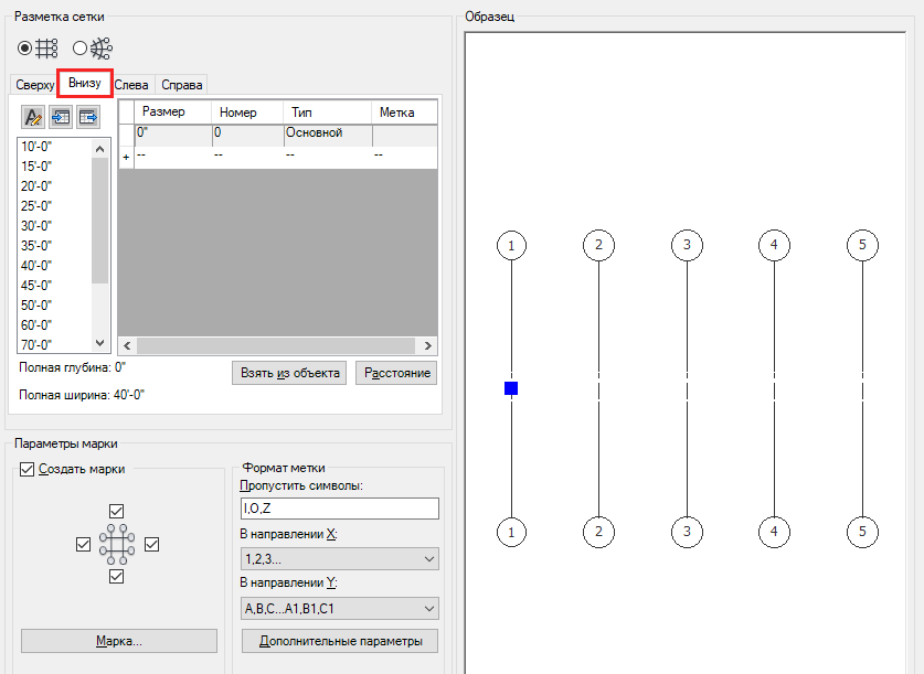 На данный момент набор планировочных элементов на вкладке "Снизу" неполон. Если эта конфигурация уже является подходящей (как в приведенном ниже примере), можно либо разместить сетку на чертеже, либо перейти на вкладки "Слева"/"Радиальная" для определения горизонтальных линий.