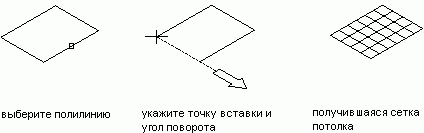 Эта процедура используется для создания сетки потолка внутри замкнутой полилинии или объекта пространства. Если сетка потолка находится внутри пространства, сетка создается на высоте потолка пространства.