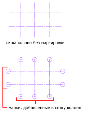 Прим.: При добавлении линии сетки в существующую настраиваемую сетку колонн автоматически формируются метки со значением по умолчанию "-", не поддерживающие автоматическую маркировку. При удалении линии сетки автоматическая маркировка не поддерживается.