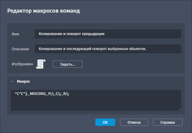 Имя используется в качестве подписи макроса команд на вкладке «Сохраненные» палитры «Макросы команд», а также на кнопке при добавлении на вкладку ленты «Автоматизация».