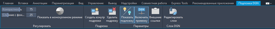 Изменение параметров отображения, подрезки, слоев и привязки подложки DGN .