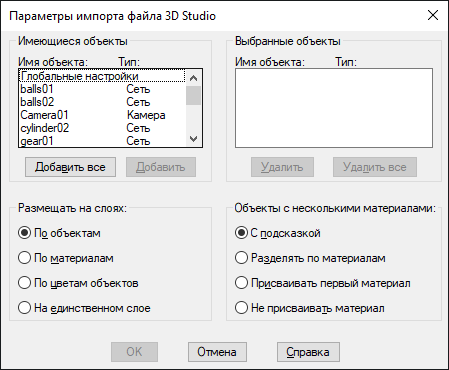 Позволяет просмотреть имеющиеся и выбранные 3D объекты, распределить объекты по слоям и задать способ обработки объектов, которым присвоено более одного материала.