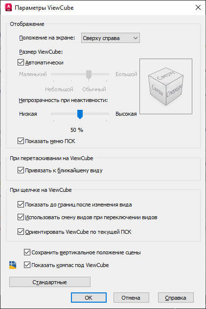 Задание размера инструмента ViewCube (Видовой куб).