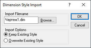 | Import Filename | Задание импортируемого текстового файла ASCII. По умолчанию файл имеет расширение DIM, и он должен иметь формат, созданный DIMEX Express Tool. Все размерные стили в выбранном файле импортируются в текущий чертеж. Стили текста также импортируются. |