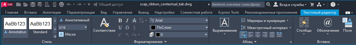 При выборе объекта определенного типа или выполнении некоторых команд отображается контекстная вкладка ленты вместо панели инструментов или диалогового окна. Она закрывается по завершении работы с командой.