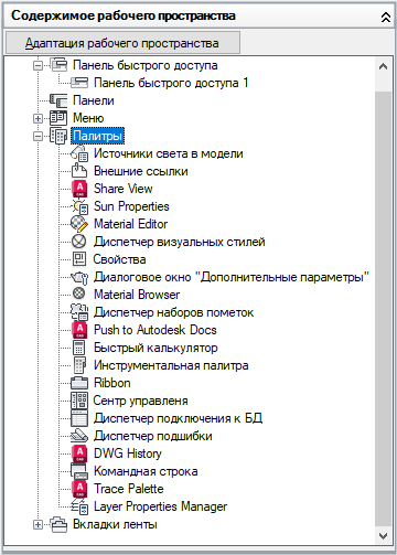 - На вкладке "Адаптация" разверните на панели "Адаптации <имя файла>" узел "Рабочие пространства", щелкнув на знаке "плюс" (+) рядом с этим узлом.
