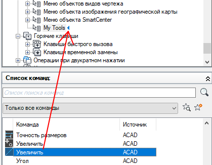 - Перетащите команду, которую требуется добавить, с панели "Список команд" в контекстное меню, расположенное на панели "Адаптации: <имя файла>".